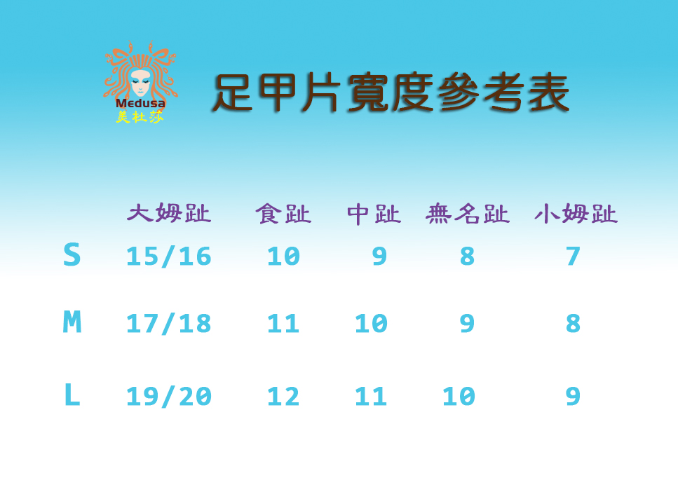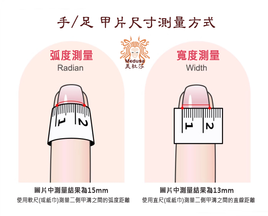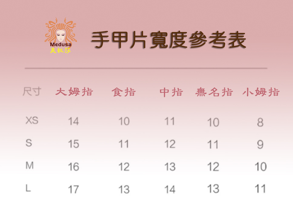 - 個別指甲若與尺寸表上相差 1mm左右的,可以按同尺寸選購。