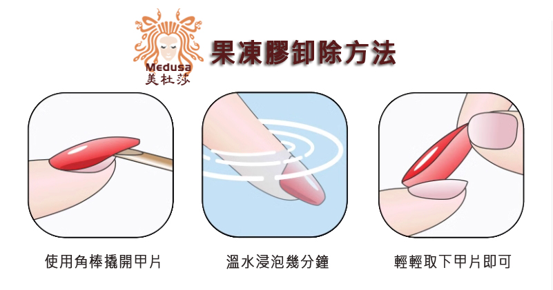 - 若是用膠水黏貼的甲片需用「卸膠劑」卸除,但對穿戴甲有溶解作用,卸除後的穿戴甲無法進行重複使用。